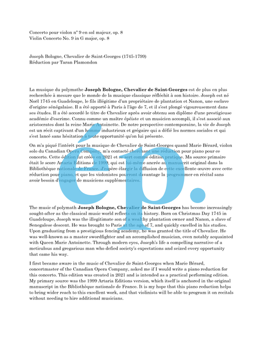 Chevalier de Saint-Georges' Violin Concerto No. 9 in G Major, op. 8 [Digital Download]